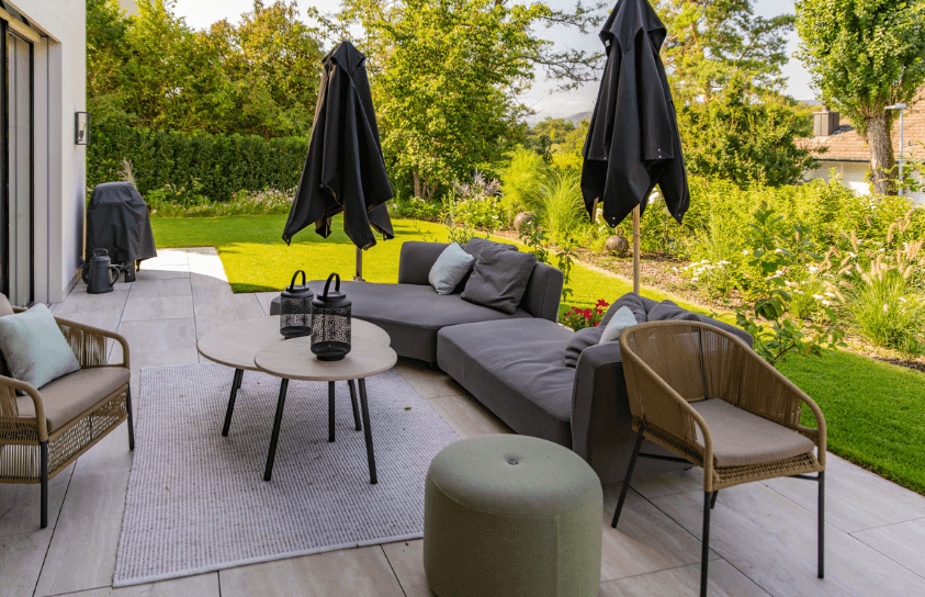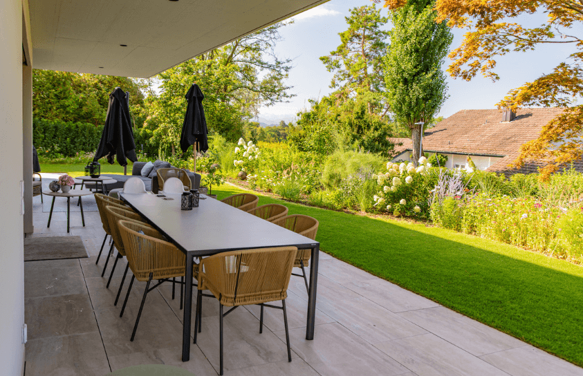 In diesem ansprechend gestalteten Garten schaffen die üppigen, grossformatigen Pflanzen ein einladendes und grosszügiges Ambiente, das zum Verweilen einlädt. Die Verwendung von Travertin-Plattenbelägen unterstreicht die warme und harmonische Atmosphäre und ergänzt die natürliche Ästhetik des Raumes.