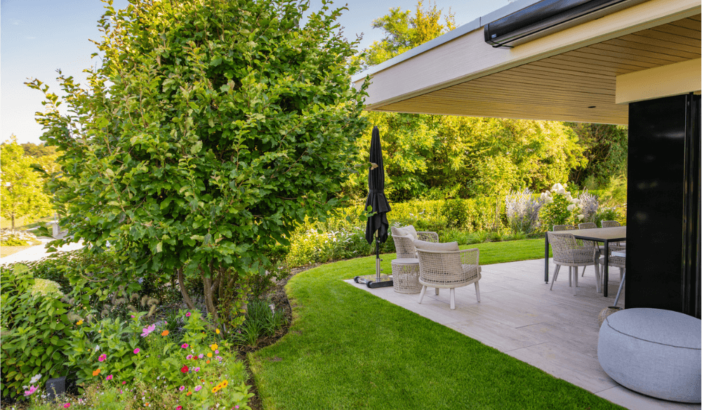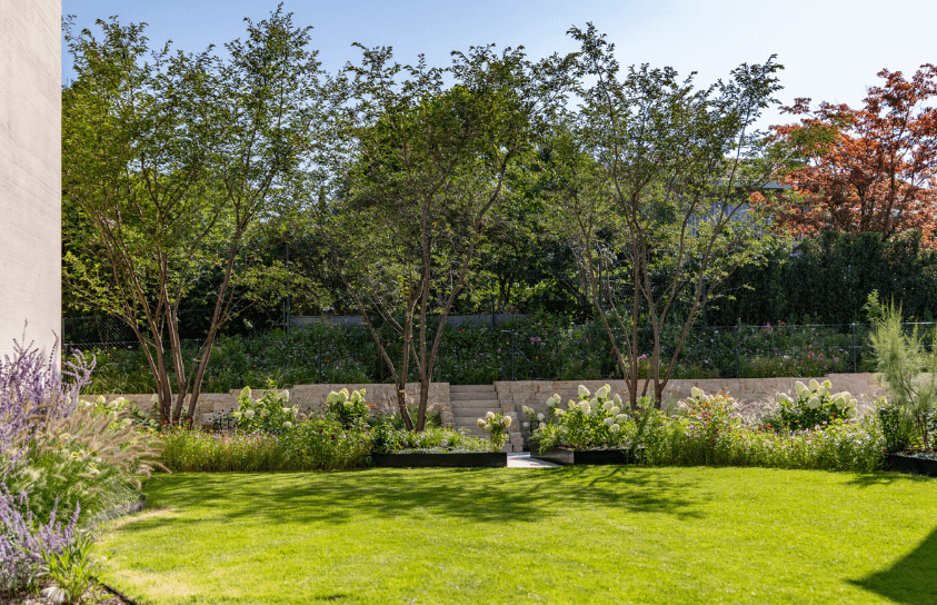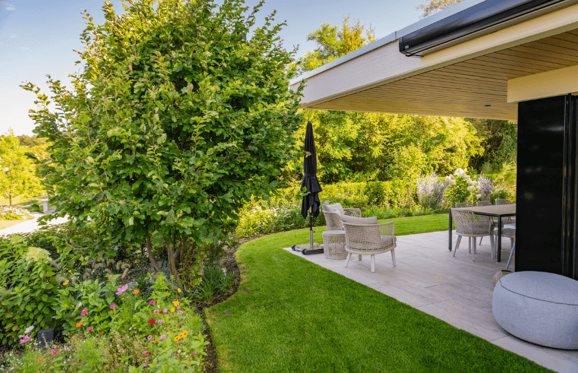 Für die kleinen Gartenbesucher bieten diverse Kleintiernistflächen spannende Entdeckungsmöglichkeiten und tragen zu einem ökologisch wertvollen Lebensraum bei. Gleichzeitig ermöglichen sorgfältig platzierte Hecken als Sichtschutz die Schaffung von privaten Rückzugsorten, ohne das Gefühl von Weite und Offenheit zu beeinträchtigen. Die Integration von Natursteinmauern und Pflanzen schafft dabei eine perfekte Balance zwischen Privatsphäre und Durchlässigkeit, was den Garten zu einem Ort der Ruhe und Entspannung macht.